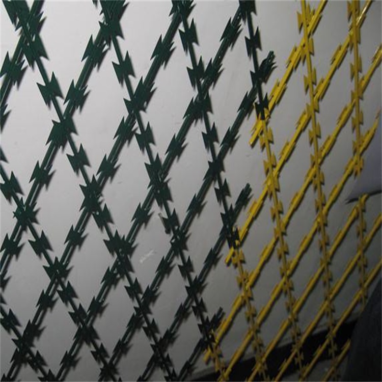 籬笆型刀片刺繩 籬笆型刀片刺網是一種刀片刺網做成籬笆型的防護網,刀片實用且外形美觀,主要用于圍欄、門窗的防護和軍事防御等長度、直徑可依客戶要求制作。