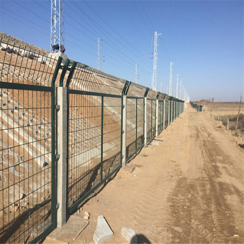 高鐵防護柵欄為冷拔鋼絲點焊熱鍍鋅再熱浸塑網片,外型尺寸為2760*1790mm,網格尺寸為75*150mm,鋼絲為φ4mm , 網片邊框采用30*50mm的方管焊接而成,防盜螺栓的螺柱、螺帽、墊圈等作熱鍍鋅處理。高鐵防護柵欄表面采用熱浸塑處理,顏色為墨綠色,整個結構表面平整光滑,色澤均勻,無漏鍍、開裂、脫皮及脫落等缺陷。網片浸塑所用的材料及PE表層環保性好,無污染。網片上方加裝蛇腹形滾刀網,有效的防止攀爬。