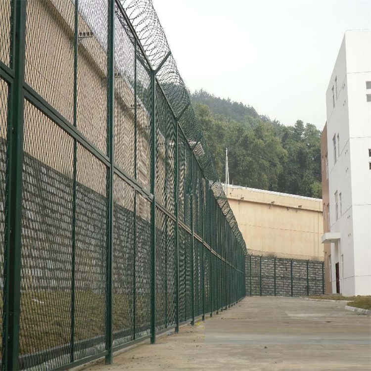 監獄鋼網墻又稱作“Y型安全防御護網”,是由V型支架立柱,加強型焊接片網,安全防盜銜接件和熱鍍鋅刀片刺籠組成強度和安全防御性級別很高。近年來,被廣泛應用在監獄,軍事基地等高安全場所。注:如果在監獄護欄網頂部加裝刀片刺絲、刀片刺繩后又很好的增強了安全防護功能。采用電鍍、熱鍍、噴塑、浸塑等防腐方式,具有很好的抗老化、抗曬、耐候等特色。其產品造型美觀、花樣多樣,既起到圍欄效果,又起到美化效果。由于具有安全性高、防攀爬能力好,網片銜接方式采用特制SBS緊扣件,有用避免人為的破壞性拆卸,橫向四道折彎加強筋,使網面強度明顯添加。