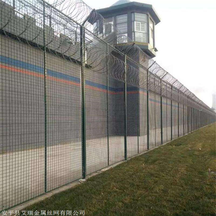監獄罪犯生活區隔離網、警戒金屬圍墻隔離網、監獄警戒線隔離網,在監獄內高層建筑物頂部設置阻隔網防止罪犯沖跳越獄。采用立式Y型柱鋼絲網加蛇腹型刀刺網,總高度1.8m,總體質量要求:協調、美觀、堅固、安全。