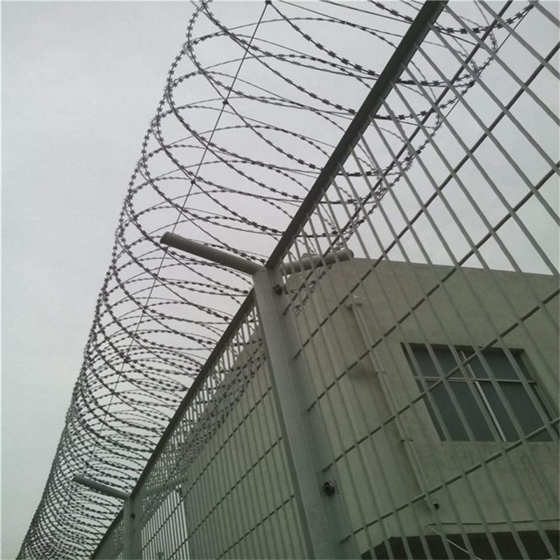 勞教所隔離護(hù)欄-看守所隔離護(hù)欄是用在勞教所、看守所的護(hù)欄,也可以用在監(jiān)獄、機(jī)場等場所。起安全隔離防護(hù)的作用,其結(jié)構(gòu)是由一般采用2米高的網(wǎng)片+2.5米高的Y字型立柱+φ500mm或φ600mmr的刀刺網(wǎng),整體下來可達(dá)2.5米左右。因其高度對犯罪分子起到無法攀爬的作用,起到很好的防護(hù)效果。
