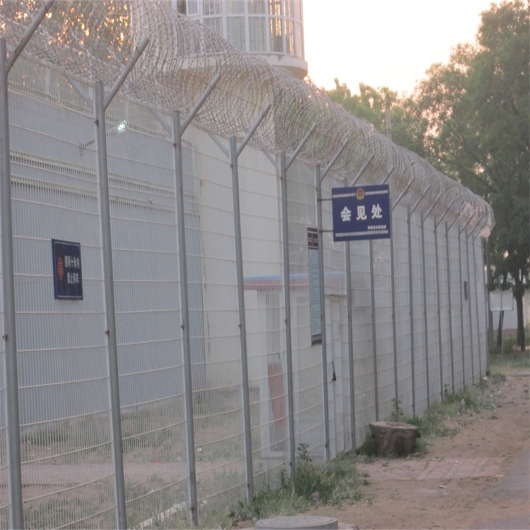 監獄防護網又稱監獄護欄網或監獄隔離柵主要是采用高強度的刀片刺網與普通防護網的結合由V型支架立拄加強型焊接片網安全防盜連接件和刀片刺網組成.刀片刺網是一種新型防護網由銳利尖角鍍鋅鋼板或不銹鋼薄板做刀片鋼絲做芯線組合而成的防護器材.