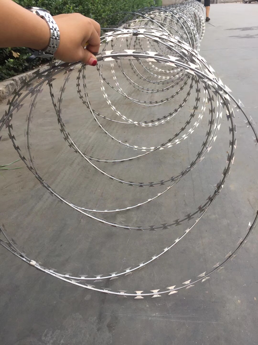 接下來就是把拉線設置好,每個支架的單臂上面有固定點,每側可設置兩道或者三道。拉線固定就是刀刺網了,刀片刺網拆下包裝帶好防護手套,根據自己需要的密度把刀片刺網放在固定拉線上面,用鍍鋅卡扣固定好。以上就是所有的交裝步驟及方法。
