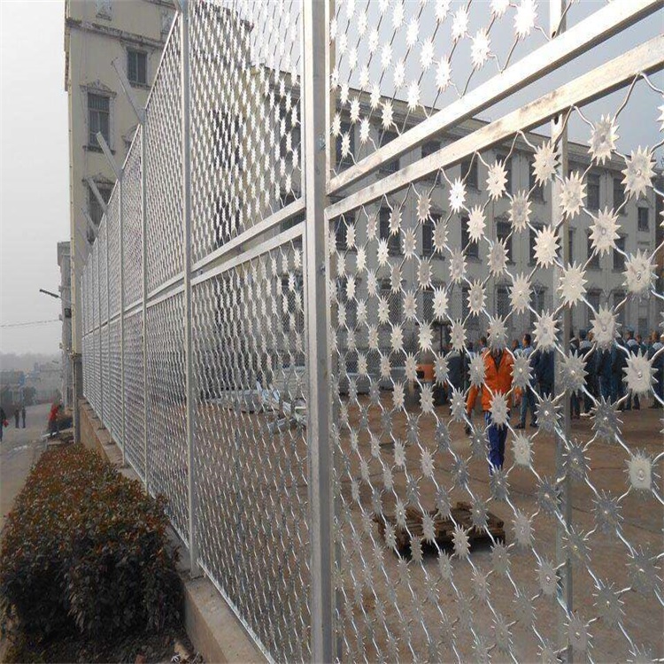 梅花刺監獄隔離網為單層梅花刺片網,直徑不小于7.5cm,刺片厚1.5mm,采用Q235低碳鋼板沖壓成型。網片為菱形網孔,網格尺寸:120mm*110mm(高*寬),網絲直徑8mm,采用S195線材高壓焊接,每一個焊點附焊梅花刺一個。
