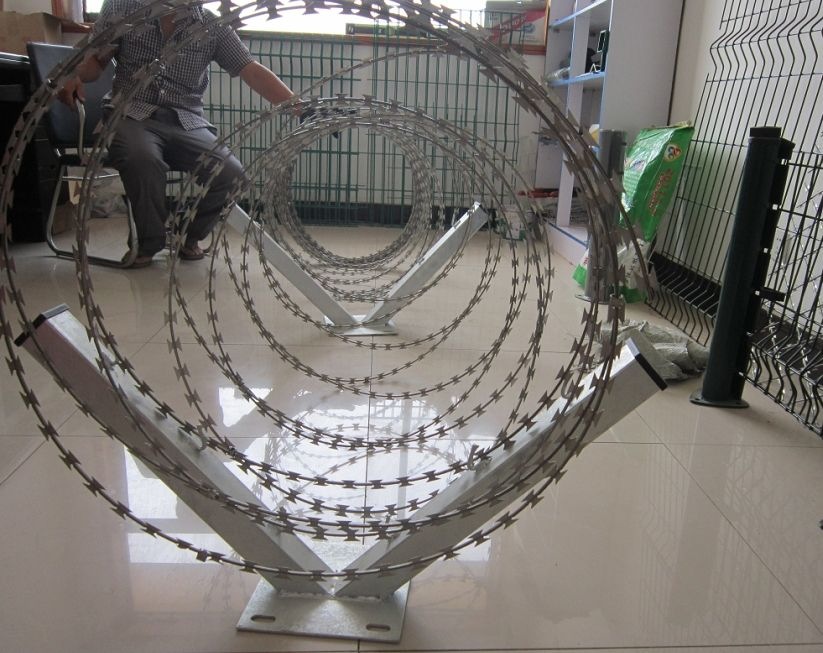 邊選中支架固定。刺絲滾籠用在鐵路上一般用立柱支架和加密支架固定刀刺網(wǎng)。用在其他場(chǎng)所多用V型支