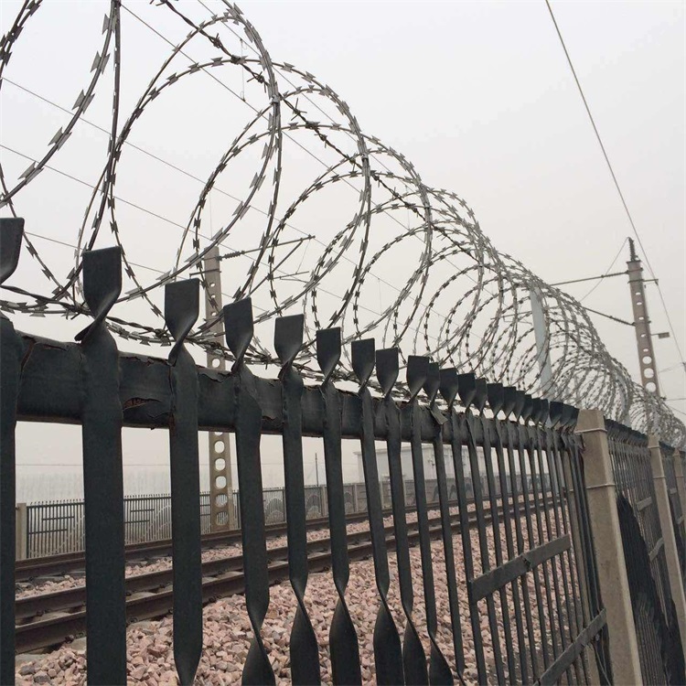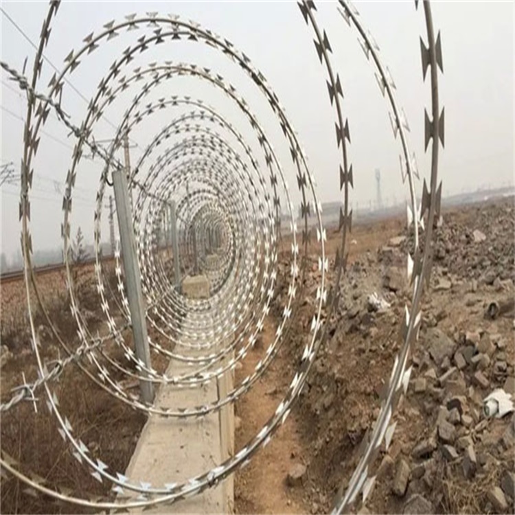 高鐵刺絲滾籠是沖剪鋼板成銳利的尖刀帶子,然后包裹中碳鋼絲(筋絲)之上。鋒利的刀片刺絲由雙根線扣卡子組裝后成蛇腹狀,讓人看到不寒而粟,能夠起到了恐嚇作用,實際上人挨上刀片刺絲就被劃破,實際效果明顯。該產品施工便利快捷。深受軍隊和警察喜好。各國已將刀片刺網廣泛用于飛機場、軍事重地、邊境線、監獄、政府機關、銀行,以及別墅的圍墻、高速公路、鐵路護欄等地。