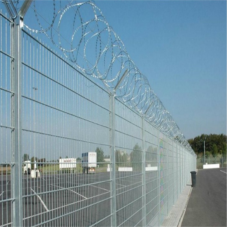 在結(jié)構(gòu)設計上,機場護欄網(wǎng)通常采用Y型支架立柱與加強型焊接片網(wǎng)的組合形式。立柱多為60×60毫米矩形鋼,頂端設置Y型支架;網(wǎng)片則采用直徑4.0-5.0毫米的低碳鋼絲焊接而成,網(wǎng)孔規(guī)格常見為50×100毫米或50×200毫米。網(wǎng)片中帶有V型加強筋,這一設計有助于提升網(wǎng)面整體強度,使其能夠承受一定程度的沖擊。根據(jù)民航標準要求,飛行區(qū)圍欄凈高度不低于2.5米,豎筋間距不大于100毫米,立柱間距不超過3米,這些尺寸規(guī)定為平衡防護效果與視覺通透性提供了依據(jù)。