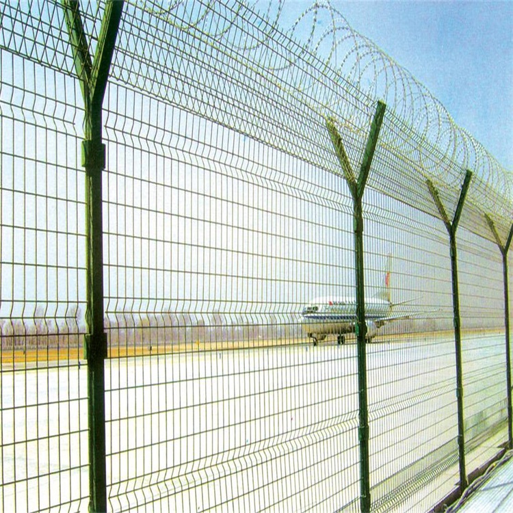 飛機場隔離柵外圍鋼網(wǎng)墻采用V型支架立柱加強型焊接片網(wǎng),安全防盜連接件和熱鍍鋅刀片刺網(wǎng)組成強度和安全防御性級別很高。被廣泛應(yīng)用在機場,軍事基地等高安全場所。
