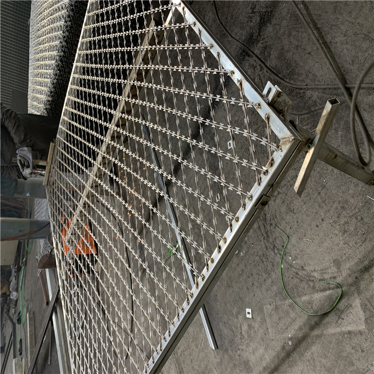 國內(nèi)監(jiān)獄、看守所等所采用的巡邏道鋼網(wǎng)墻一般為鐵絲焊接而成,上邊講到的就是鐵絲焊接型,但是也有些設(shè)計(jì)要求是焊接刀刺網(wǎng)樣式的。