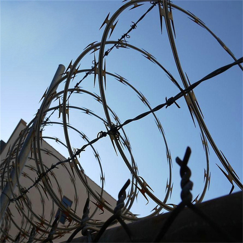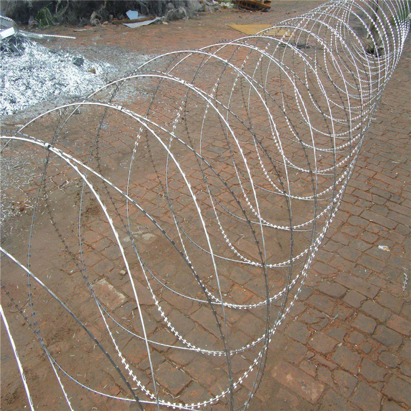 雙螺旋交叉刺繩的特點:螺旋交叉刀片刺繩牢固地夾在兩條刀片刺繩之間,用不銹鋼和鍍鋅鋼板制成。展開后,它變成十字形,也稱為雙螺旋刀片刺繩。每卷螺旋交叉刺網由單股剛性螺旋鋼絲和葉片組成,葉片均勻地分布在其上。相交圓的內圓周由夾子均勻固定,并且在拉伸時會形成菱形網絡。充分拉伸后,每個交叉卷都可以輕松展開以形成圓柱形護欄網。