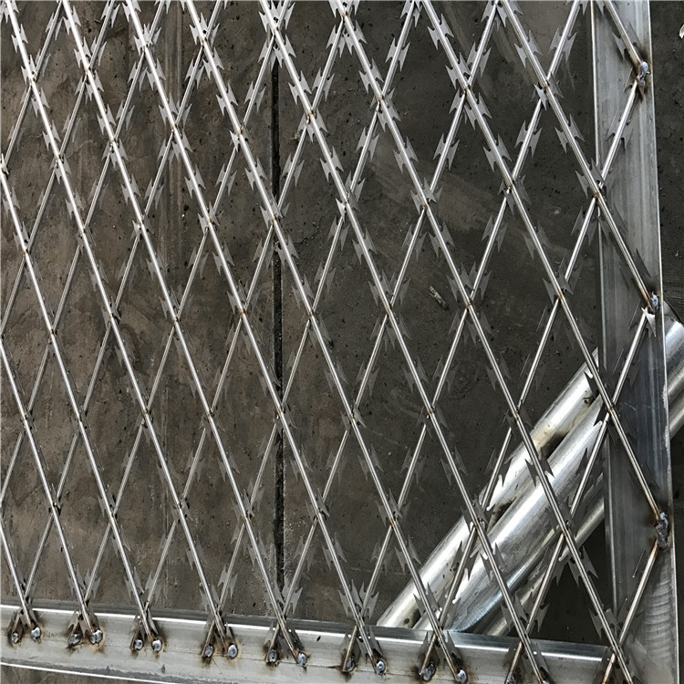 監(jiān)獄焊接刀片刺網(wǎng)網(wǎng)片規(guī)格:50mm×100mm,橫筋與豎筋夾角60度角或120度角,直線刀片刺網(wǎng)橫筋及豎筋與邊框夾角互為60度角或120度角;橫筋Ф4.0mm+縱筋Ф4.0mm 。