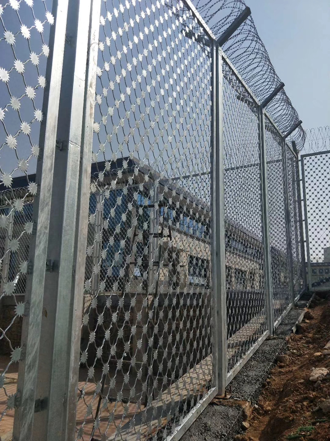 監(jiān)獄太陽花防爬隔離網(wǎng)@梅花刺片隔離網(wǎng)@監(jiān)獄太陽花刺片防護(hù)網(wǎng)也被稱為太陽花刺片監(jiān)獄護(hù)欄網(wǎng),它的立柱由Y形鍍鋅鋼管制成,鋼管的壁厚為150 * 150 * 8mm,網(wǎng)架的尺寸為60 * 60 * 2.5m。此外,監(jiān)獄防攀爬護(hù)欄網(wǎng)的Y形柱還配備了不銹鋼刀片刺網(wǎng),并對其表面進(jìn)行了噴涂。常見的是深綠色噴涂和銀灰色噴涂,看起來高端,簡單而美麗,并且可以起到防腐防銹的作用,還可以起到裝飾環(huán)境的作用。