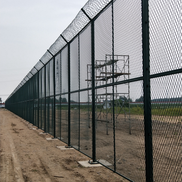 從結(jié)構(gòu)組成來看,機場圍界網(wǎng)主要分為四部分:一是基礎(chǔ)結(jié)構(gòu),采用鋼筋混凝土澆筑地基,深度不低于0.8米,部分軟土地基需加深至1.2米,確保圍界抗風(fēng)載、抗撞擊穩(wěn)定性;二是網(wǎng)體主體,主流采用高強度鍍鋅鋼絲或不銹鋼絲焊接網(wǎng)片,網(wǎng)孔規(guī)格多為50mm×100mm或75mm×150mm,鋼絲直徑≥4mm,表面經(jīng)浸塑或噴塑處理(顏色以草綠、深灰為主),兼具防腐蝕與隱蔽性;三是頂部防越設(shè)施,飛行區(qū)、油庫等重點區(qū)域圍界頂部,需加裝0.5-0.8米高的刀片刺網(wǎng),刀片刺網(wǎng)采用交叉螺旋式安裝。四是輔助結(jié)構(gòu),圍界每隔3-5米設(shè)置混凝土或鋼管立柱,立柱與網(wǎng)體通過防盜螺栓連接,部分區(qū)域還會在圍界底部加裝防鉆鋼板,防止人員從底部挖洞入侵。